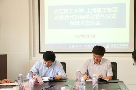 董国海部长和龚剑总工程师作为校、企代表签订了大连理工大学与上海建工集团股份有限公司战略合作协议,并就今后的合作方向及内容等达成共识。随后,双方进行技术交流汇报,并就相关问题展开了热烈的讨论。